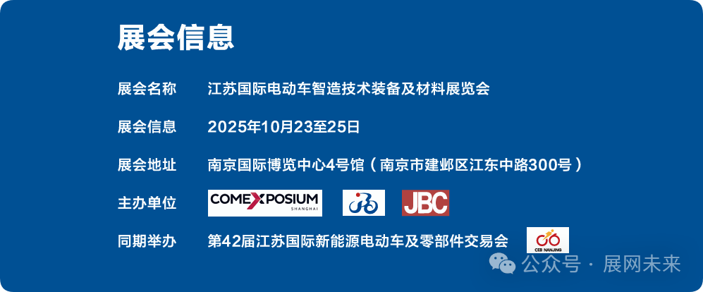 这场展会不仅是技术展示的舞台,更是行业转型的"信号灯"。在新国标实施前夕,率先在SVMT展会上锁定智能装备与新材料资源的企业,必将在未来市场竞争中赢得先发优势。2025年金秋十月,让我们相约南京,共同见证电动车产业的智造革命!